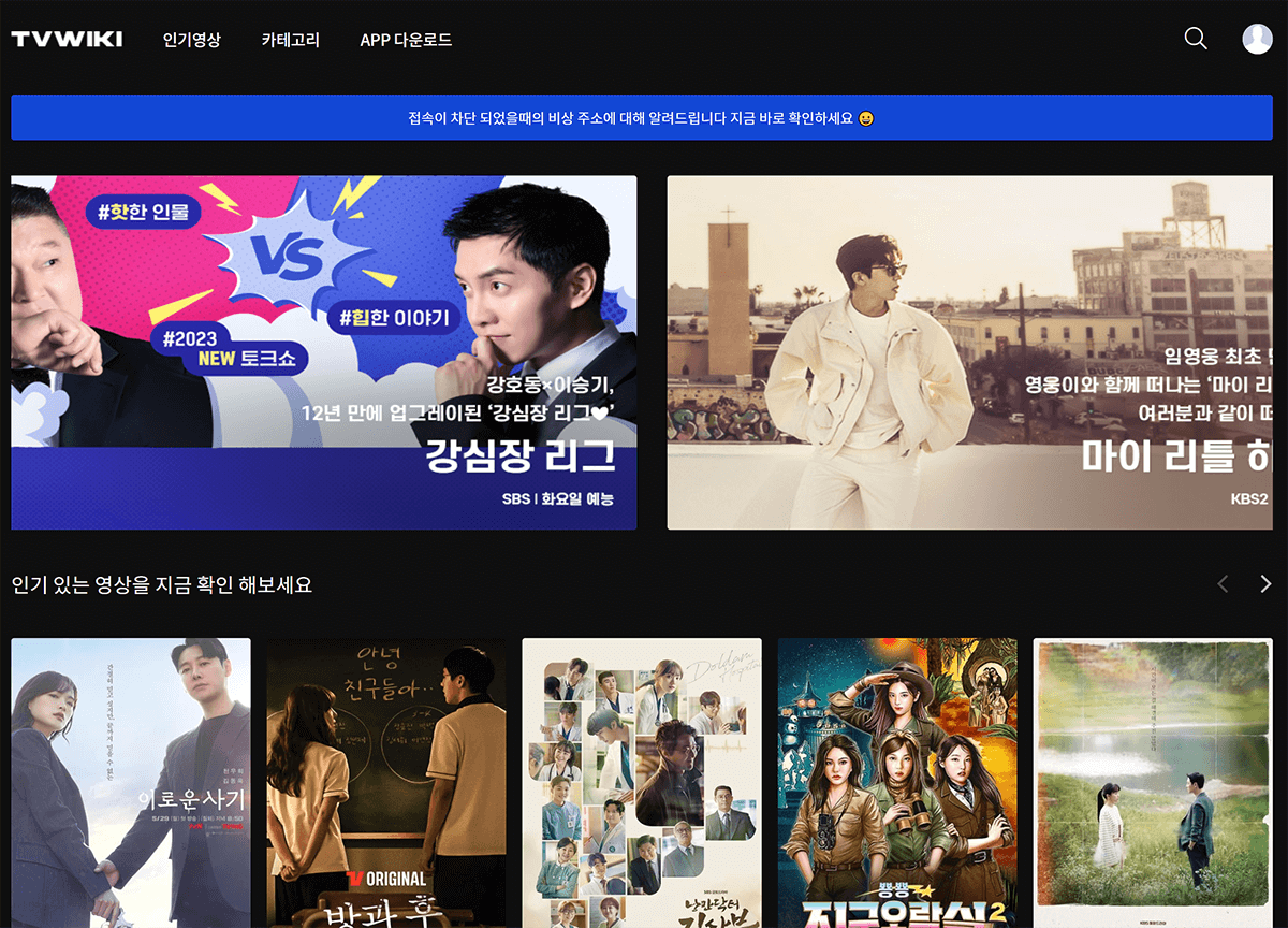 티비위키도 누누티비와 비슷한 화면 구성이고 광고가 없습니다