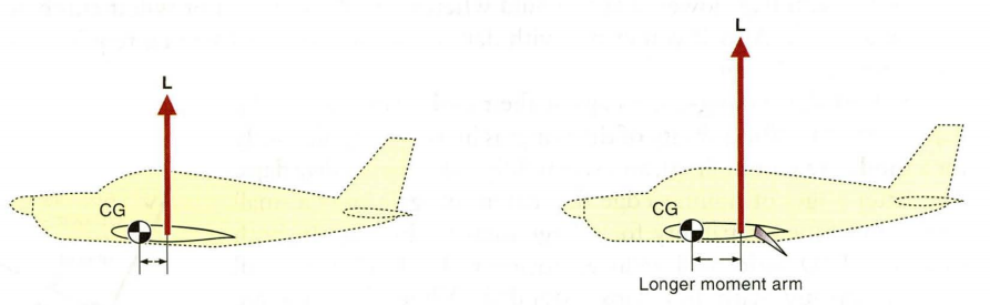 날개의 뒤쪽에서 Trailing Edge Flaps 이 확장되면 그 결과 Camger 가 증가하고, Center of Pressure 가 뒤쪽으로 움직이게 됩니다