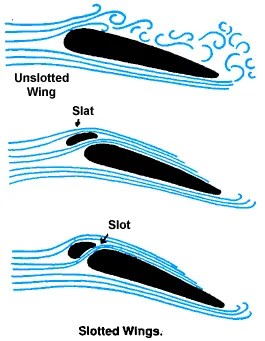 High Angle Of Attack 일때, 날개의 윗면에서 airflow 가 분리되고 turbulent 가 형성 된다. 이것의 날개의 lifting 능력을 떨어뜨려 stall condition 으로 이끈다. 몇몇의 항공기는 leading-edge devices 를 가지고 있는데 이것이 날개의 윗면으로 공기가 흐르도록 만들어 준다. 이것이 stall 을 늦춰주고 airflow 의 seperation 을 delay 시켜 준다. 따라서 낮은 속도에서 High AOA 상태로 비행 할수 있도록 만들어 준다. slat 형태로 있다가 날개의 앞과 아래쪽으로 확장 되어 진다. 어떤 항공기는 fixed slot 을 가지고 있는데, 날개의 leading edge 에 built 되어 있다. 하지만 이 형태는 drag 를 많이 형성 하므로 많이 사용 되지는 않는다.