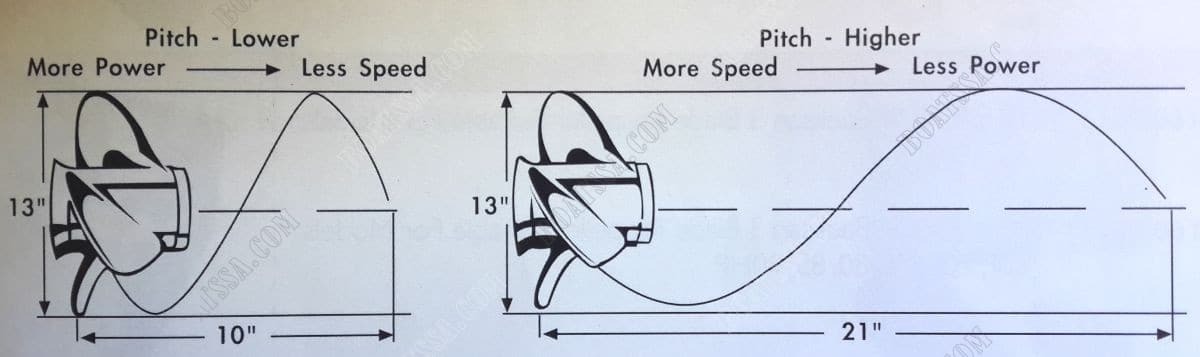 LOW PITCH는 SMAL BLADE ANGLE 과 저속 비행과 연관이 있고, HIGH PITCH 는 LARGE BLADE ANGLE 과 고속 비행과 연관이 있다. 그러나 PITCH 는 BLADE ANGLE 이 아니고 PROPELLER 가 앞으로 나아가면서 한바퀴 돌떄의 거리이다.