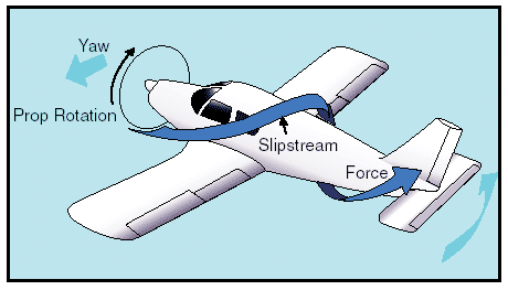 SLIPSTREAM EFFECT 시계 방향으로 PROPELLER 가 회전 하면 (COCKPIT에서 보았을 때), SLIPSTREAM 이 시계 방향으로 회전 하도록 하여 항공기 뒤 쪽으로 나선형의 형태로 흘러가게 된다. 이 현상이 비대칭형의 AIRFLOW 를 만들고 VERTICAL STABILIZER 와 RUDDER 를 치게 된다. SINGLE ENGINE 항공기가 높은 POWER 상태 일때, SLIPSTREAM 은 VERTICAL STABILIZER 의 왼쪽을 치게 되고, 항공기의 꼬리를 오른쪽으로 미는 AERODYNAMIC FORCE 를 만들어 내어 항공기가 YAW 하게 만든다. 몇몇의 항공기는 OFFSET VERTICAL STABILIZER 형태로 만들어져 이 EFFECT 를 극복 하도록 만든다. 이 현상은 HIGH POWER 와 저속에서 두드러 진다.