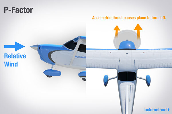 P-Factor 는 주로 Tailwheel 항공기에서 Take off 시 또는 High Angle of Attack (Low speed) 일때 발생한다. 이륙 전 Tail 은 아직 지면에 있을 것이다. Propeller Shaft 는 위를 향해 기울어져 있고, 프로펠러의 회전은 수직인 상태가 아니다.