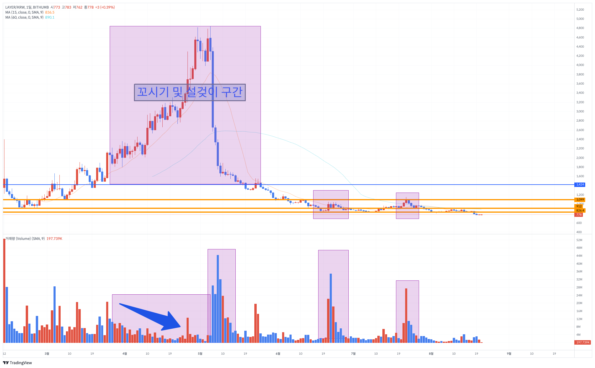 8. 현시점 매수 후 / 800원대 초반 1차 매도, 5% 상승 / 900원대 2차 매도 19% 상승 / 1000원대 올 매도 80% 상승, 그 위 가격대는 는 시체가 너무 많아 상승이 힘들어 보임