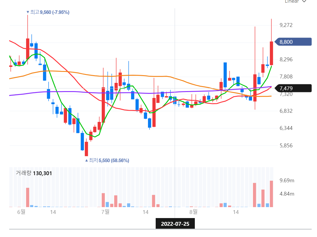 단기적으로 보았을 때는 대충 7000에서 9000원 인근 상승 하였으므로 살짝 높은감이 있기도 함