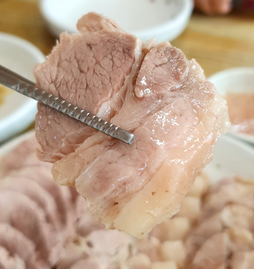 윤기 좔좔 수육 그냥 새우젓에 찍어 기본 맛을 느껴보니