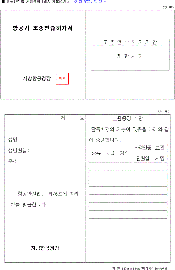 뒤쪽은 단독 비행 체크 후 그 증명내용이 훈련담당 교관에 의해 기입 되어야 합니다
