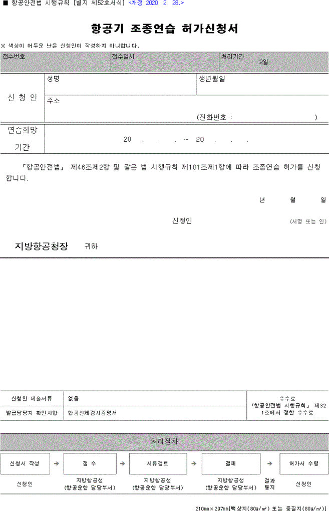 항공안전법 시행규칙 제101조 조종연습의 허가 신청 을 근거로 하여 허가신청서 및 신체검사증명서를 제출 하여야 합니다